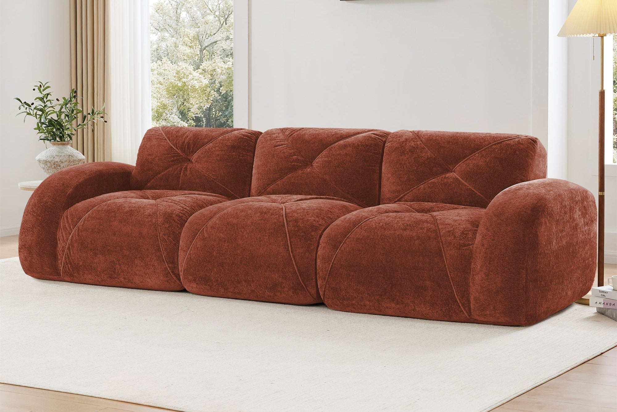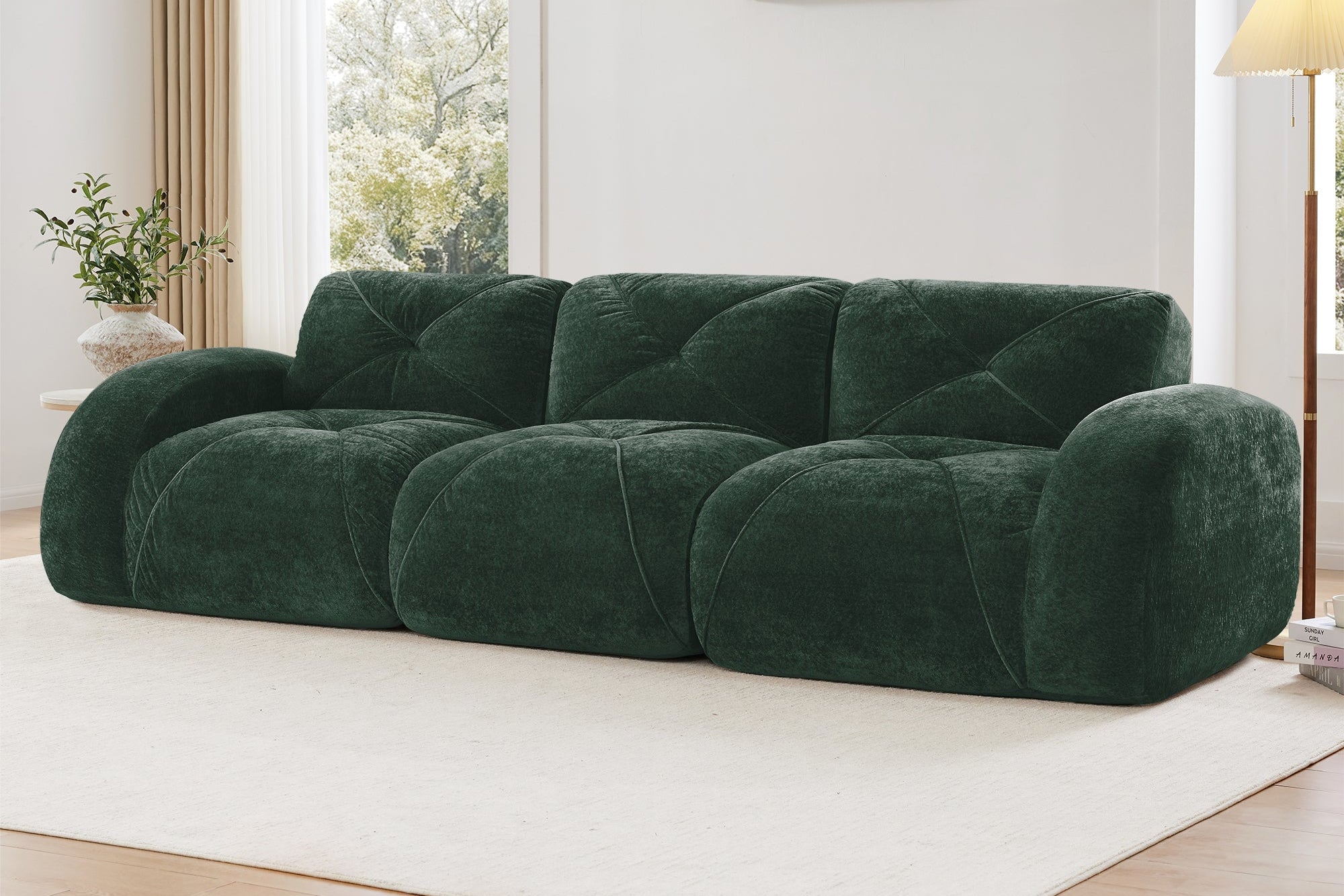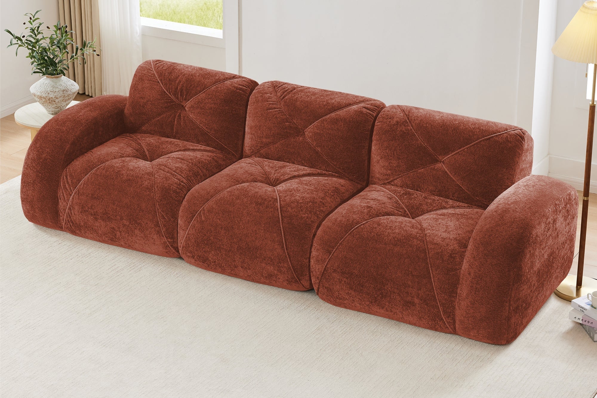 Plush velvet and high-density foam offer lasting comfort. Modular design and ottoman adapt to any space—no assembly needed.