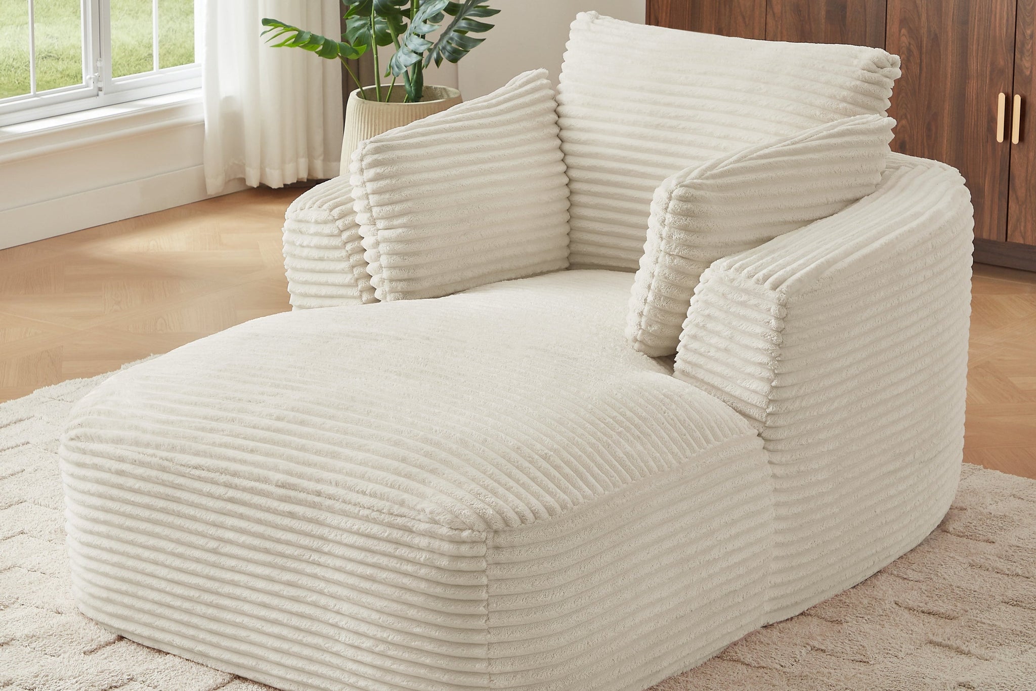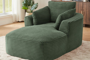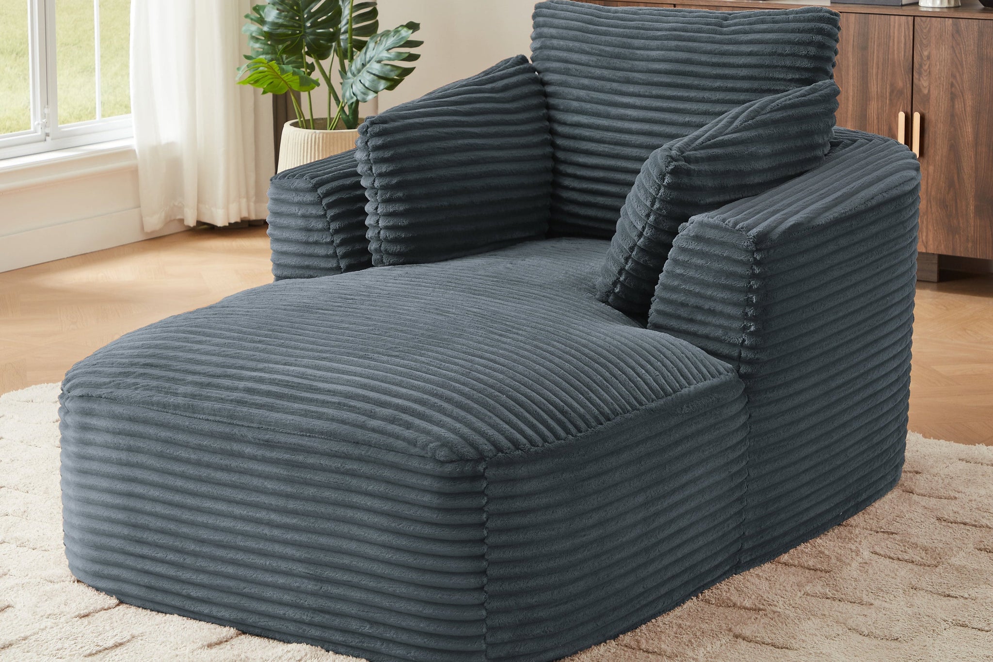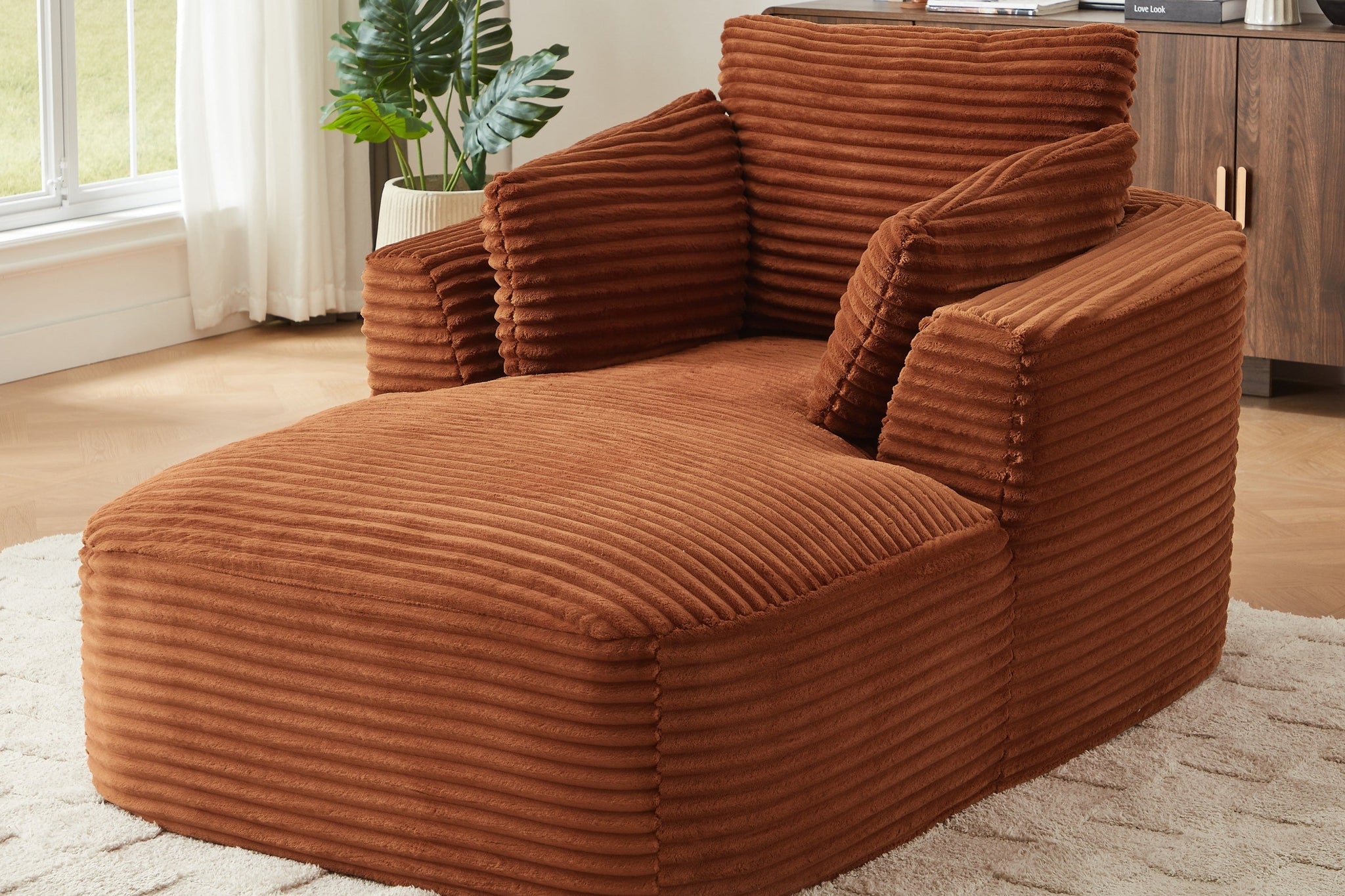 The chair features soft corduroy fabric and a spring cushion, providing plush comfort and excellent support for extended relaxation.