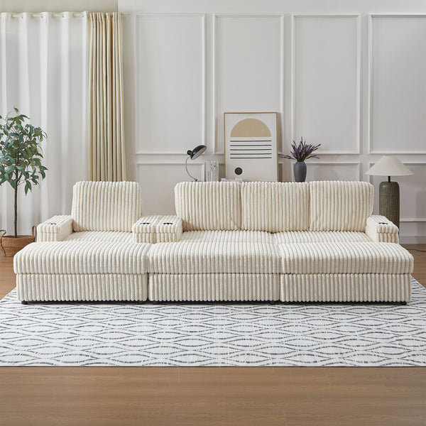 Corduroy ottoman with cup holders and hidden storage keep your space organized while adding luxury for movie nights and daily relaxation.