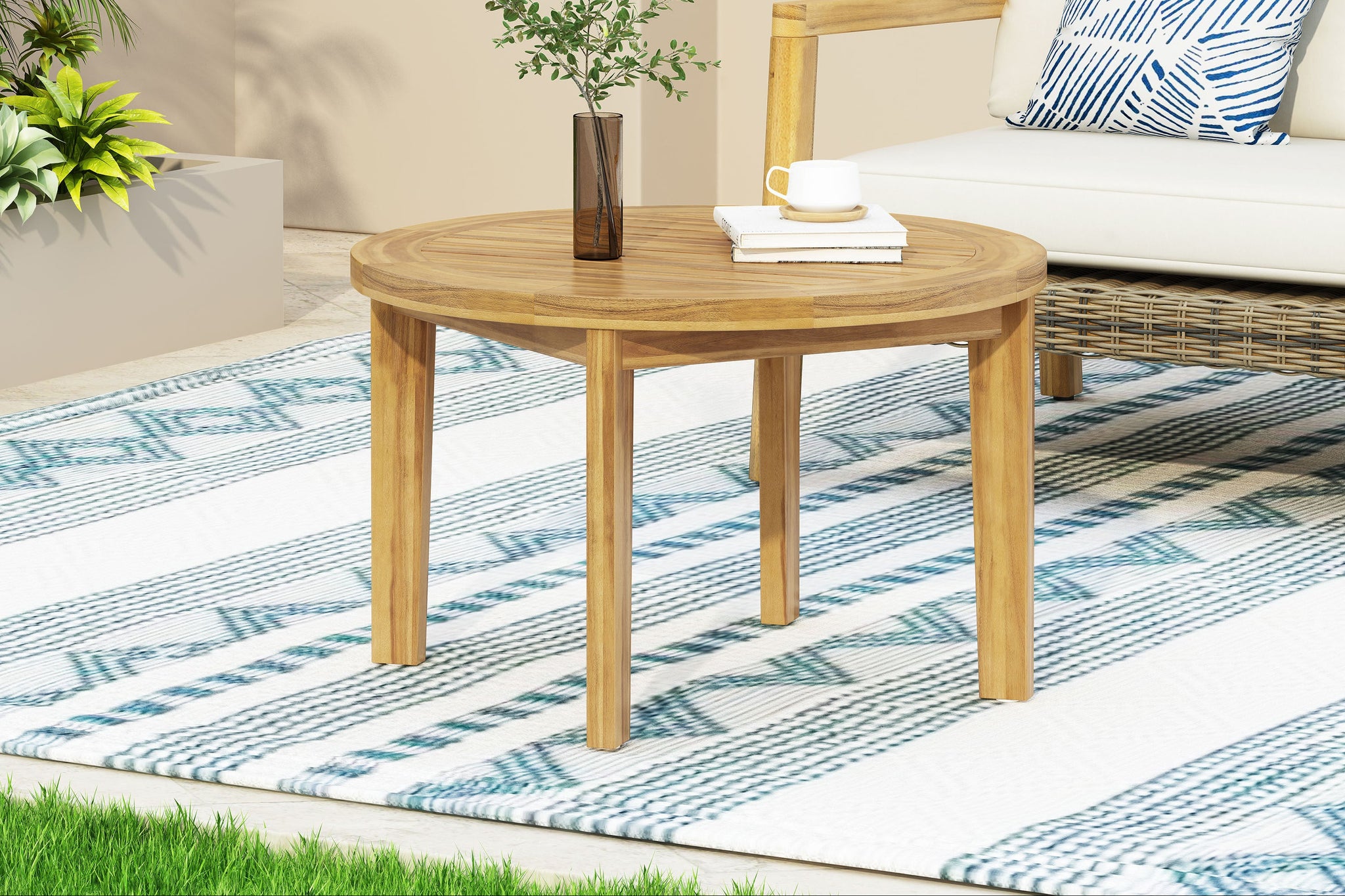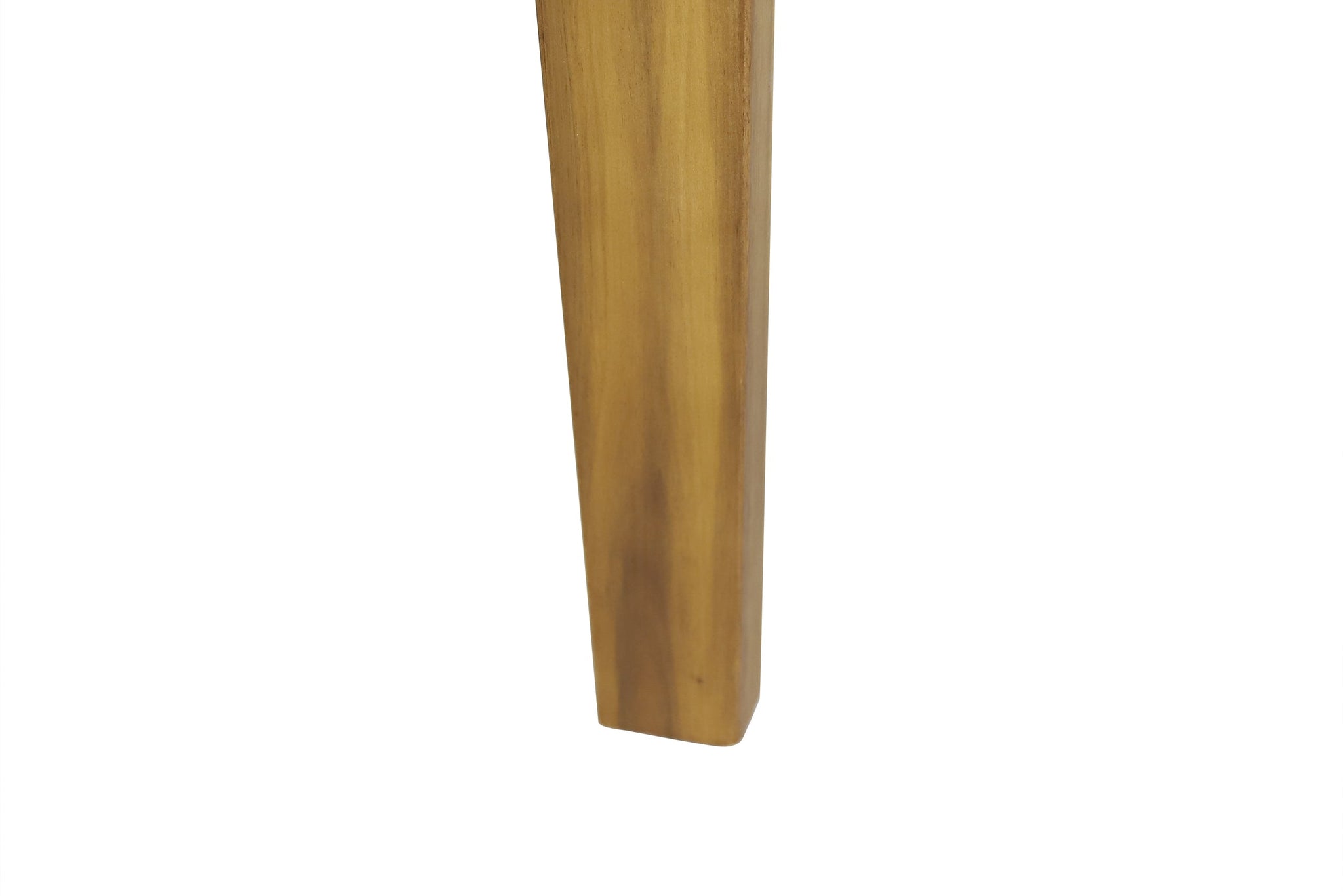 Bought for my small patio and it’s been great. The tapered legs and slatted top look modern, the acacia grain adds warmth, and it’s held up through rain and sun without warping or leaning.