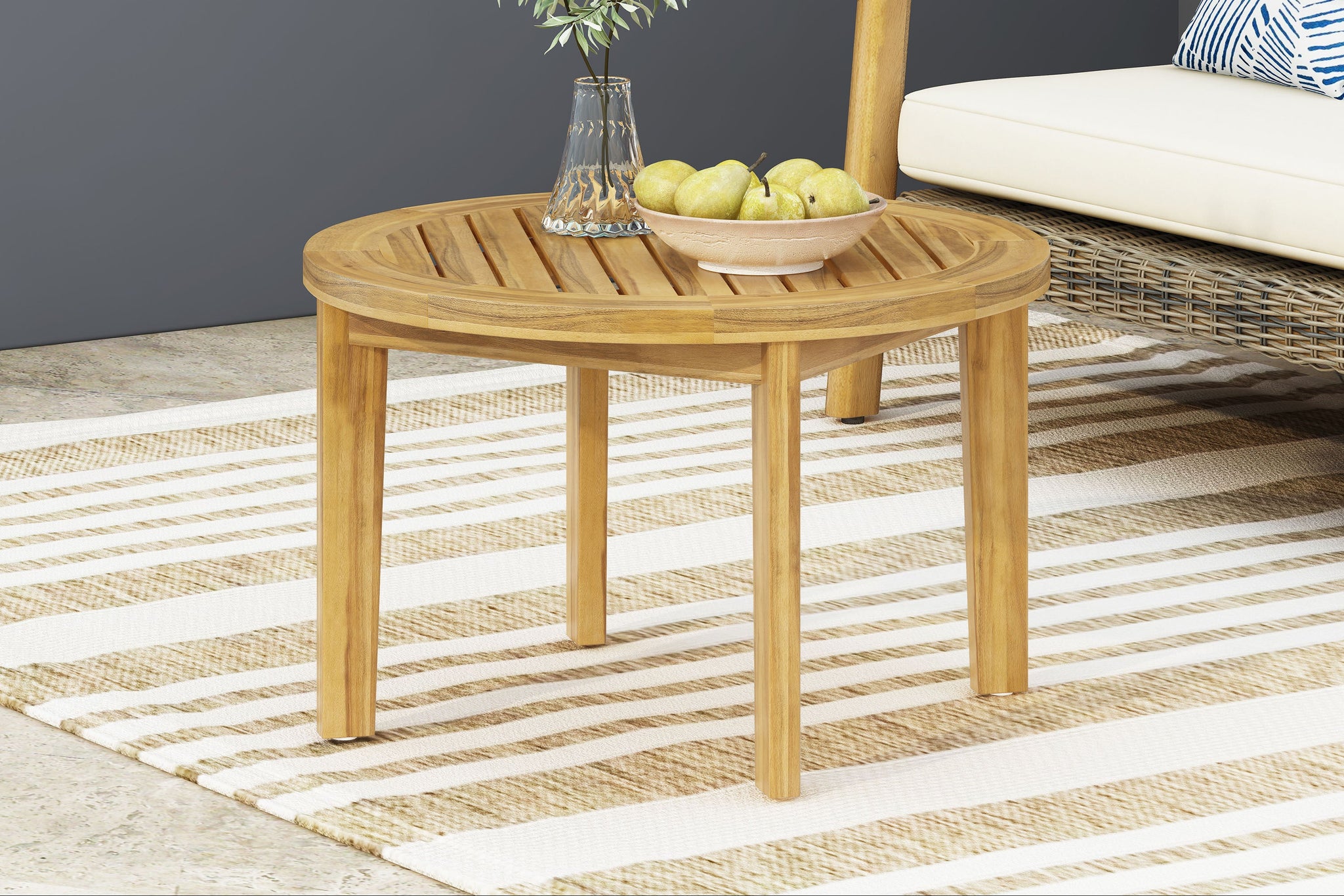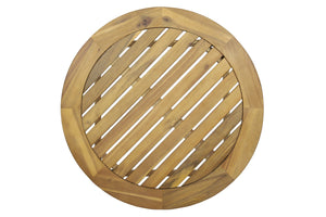 At first I was skeptical, but this compact round side table surprised me: solid acacia wood, water-friendly slatted top, and very stable even with an uneven floor. Well made and classy.
