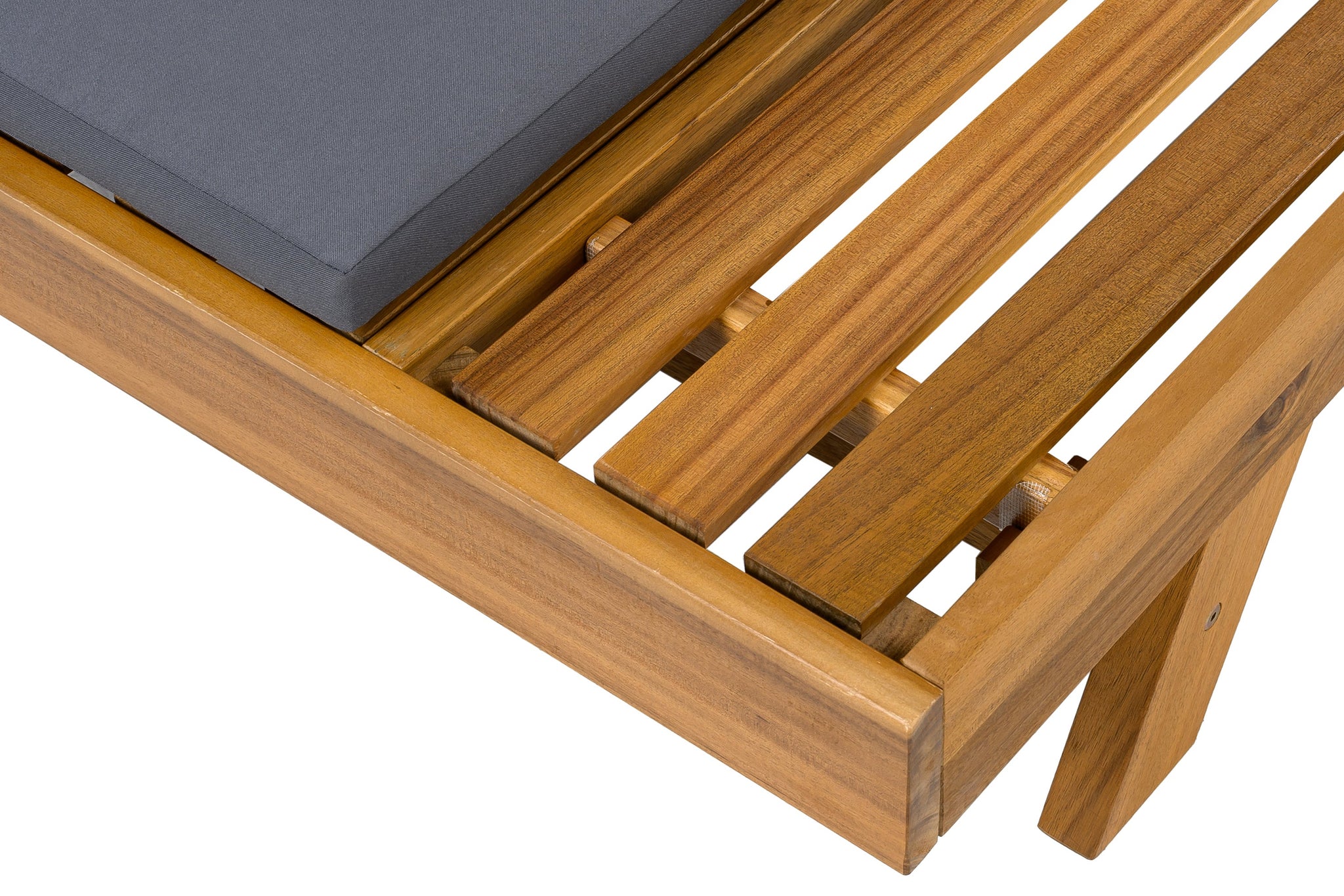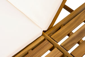 The frame is solid acacia wood with a teak finish. Acacia is naturally dense and durable for outdoor use; the finish adds UV resistance and extends the life of the chaise.