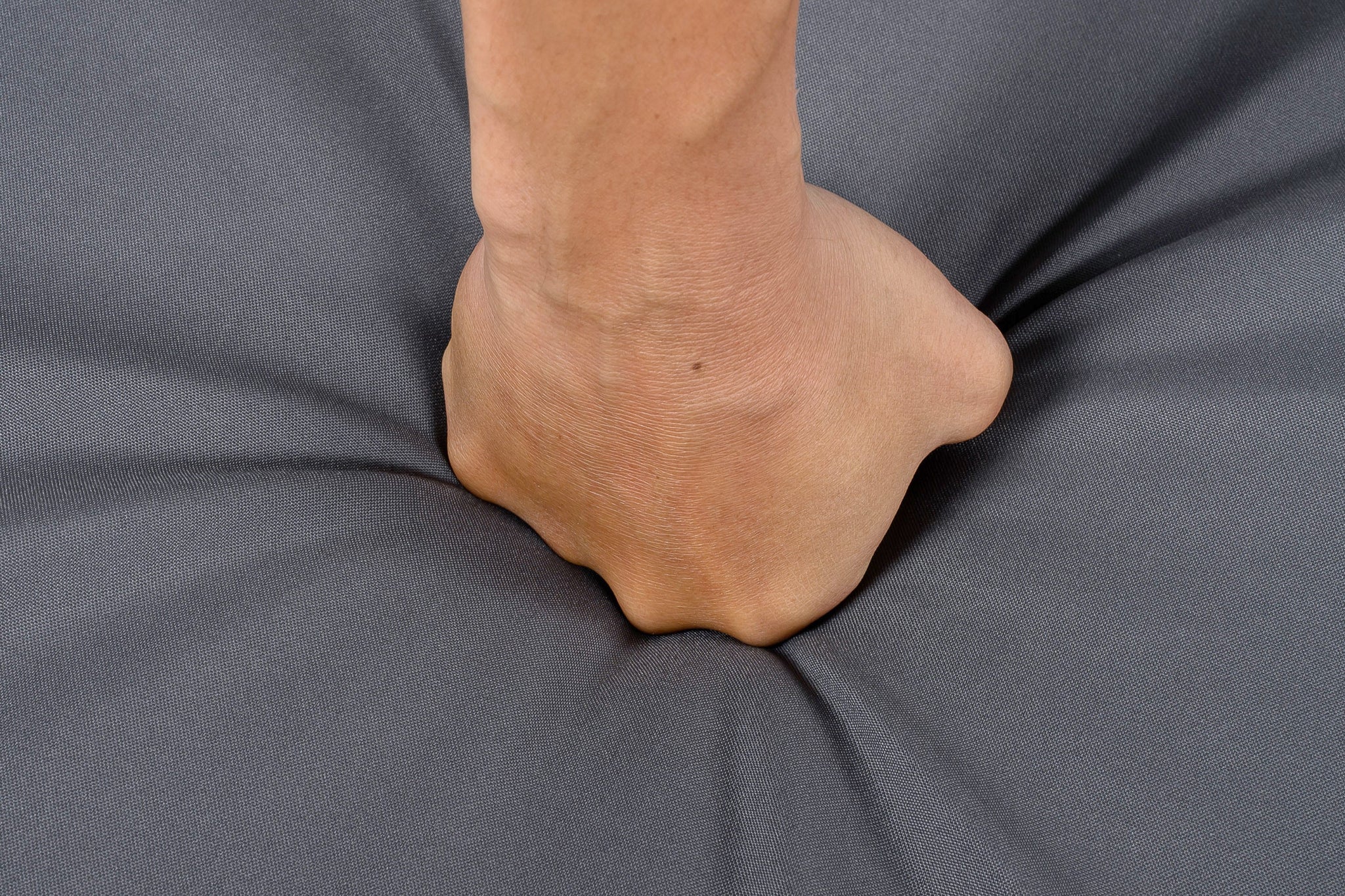 The cushion is water-resistant, repels light spills, and dries quickly. For stains, wipe with mild soap and water. It reduces mildew risk and lowers maintenance time.