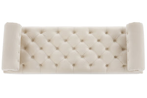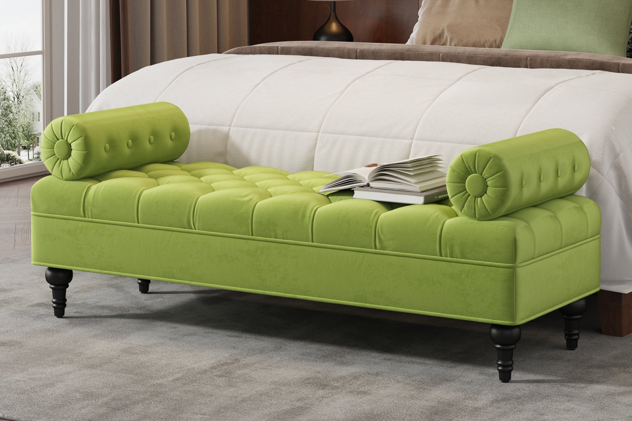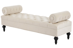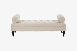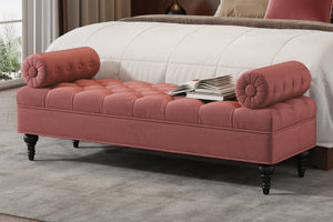 This tufted velvet bench with two pillows combines style and strength. A solid wood frame ensures durability while adding a refined touch to any bedroom or living space.