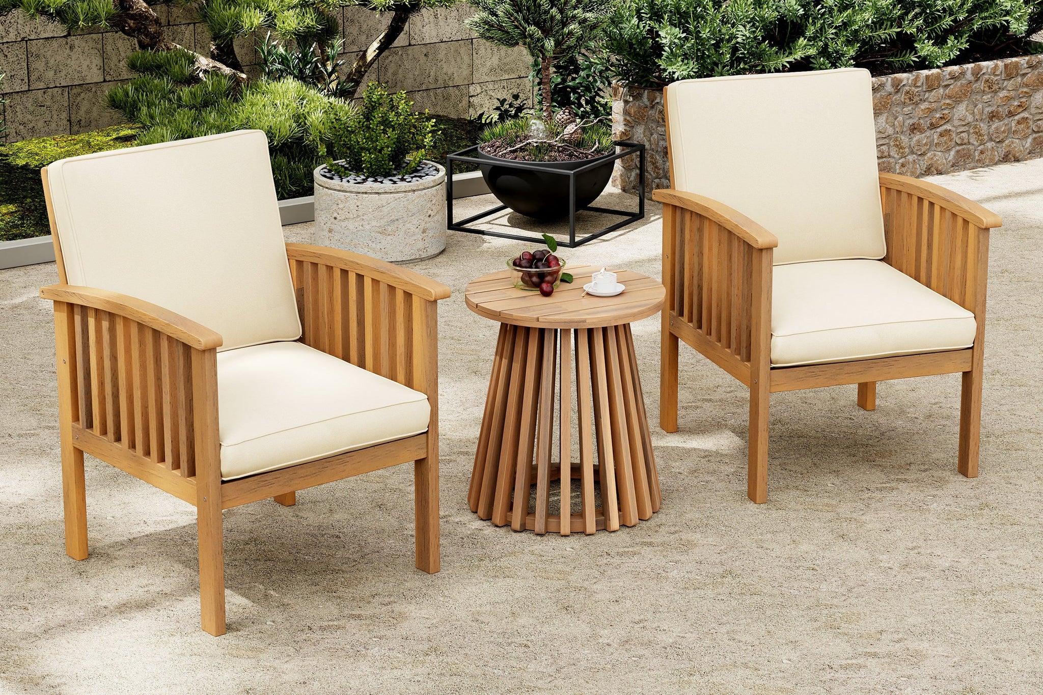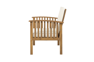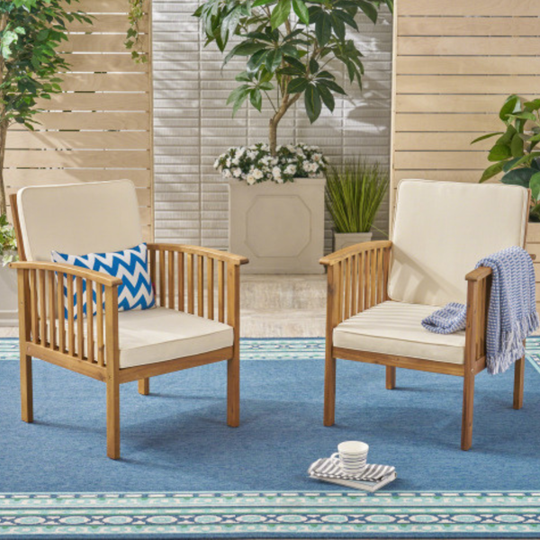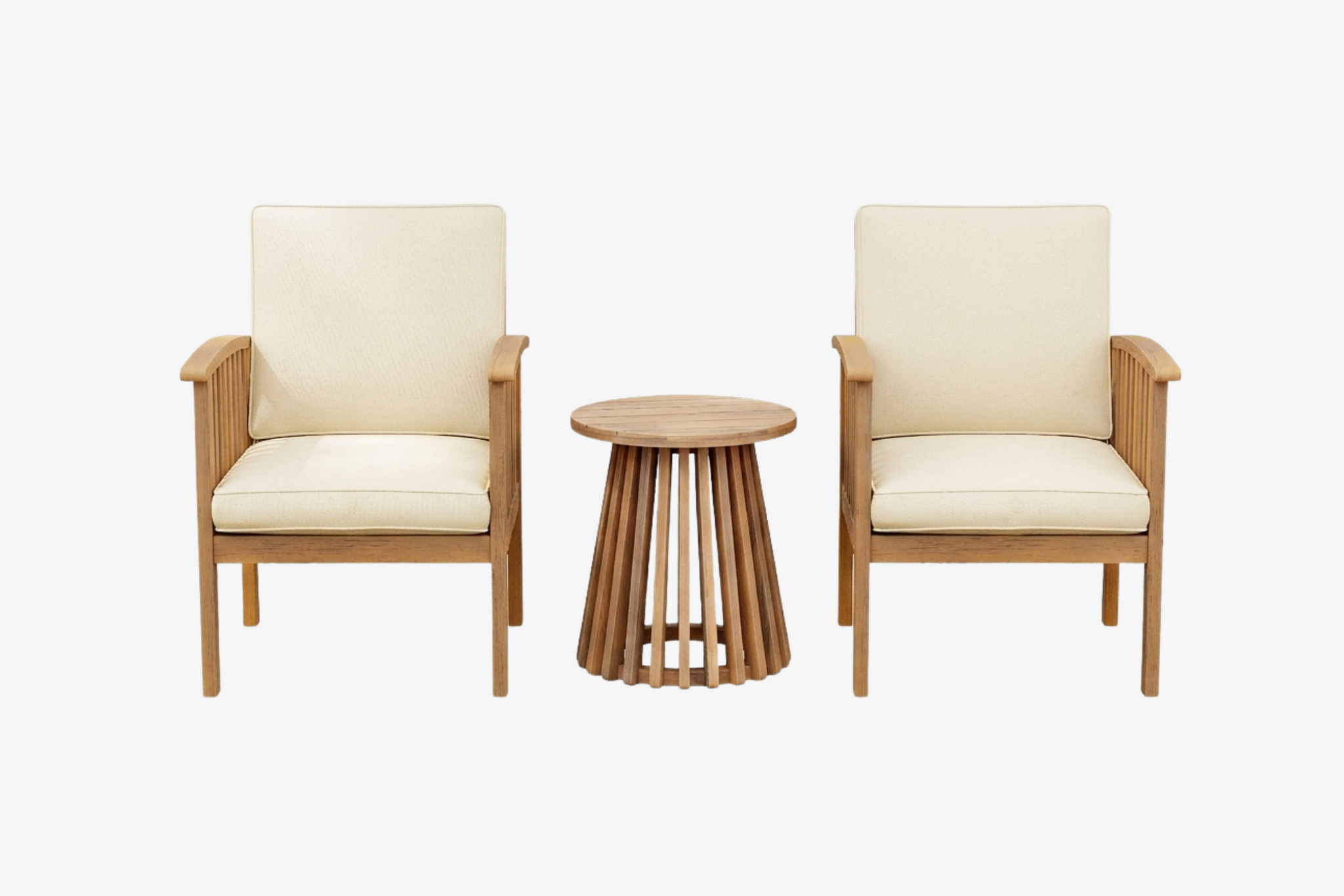The durable Acacia wood chairs with water-resistant cream cushions and a stylish side table offer a polished outdoor look. Simple wipe-clean maintenance keeps your space guest-ready year-round.