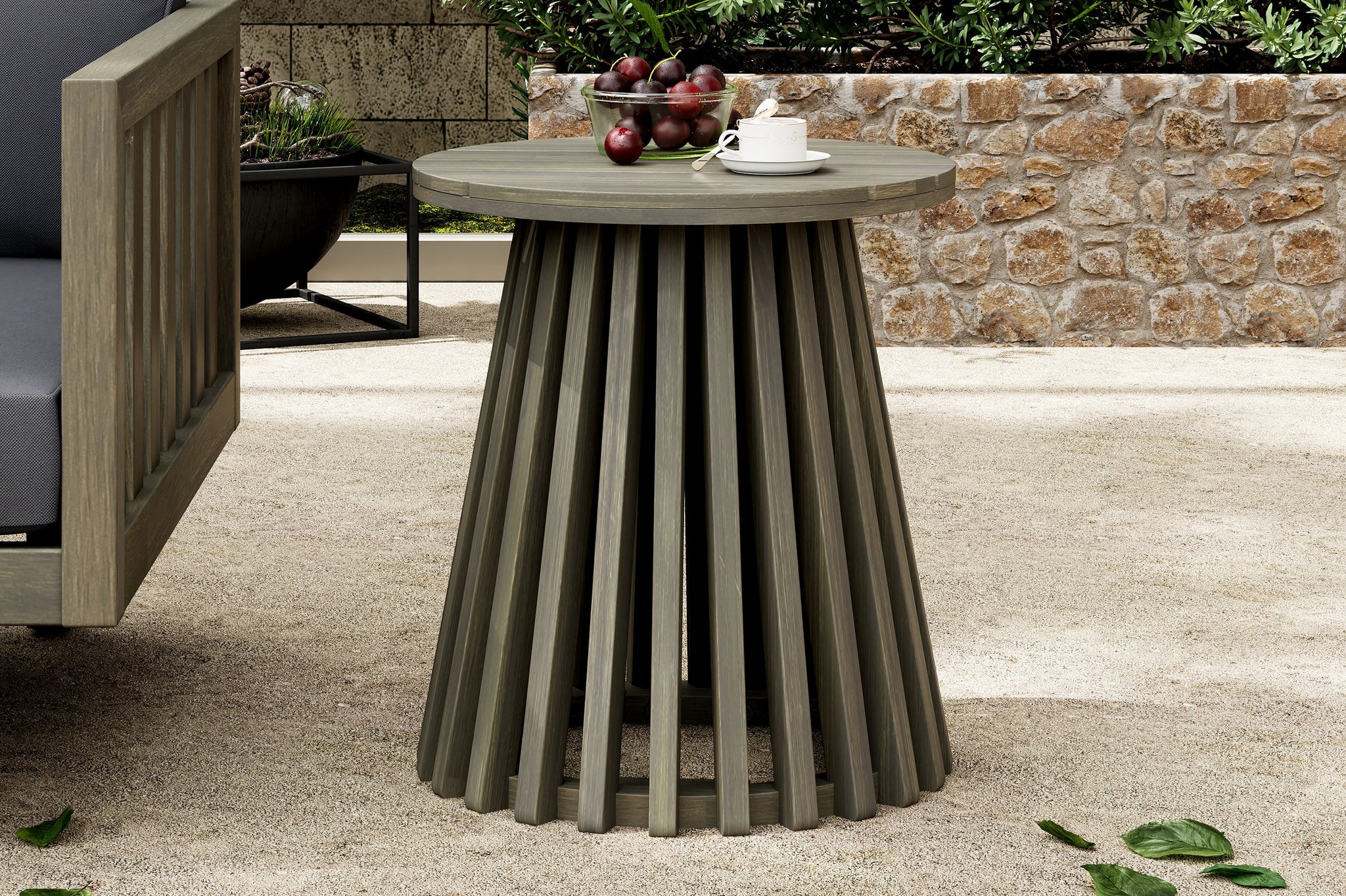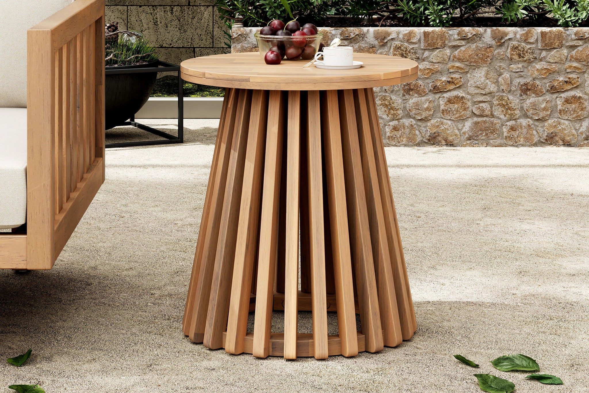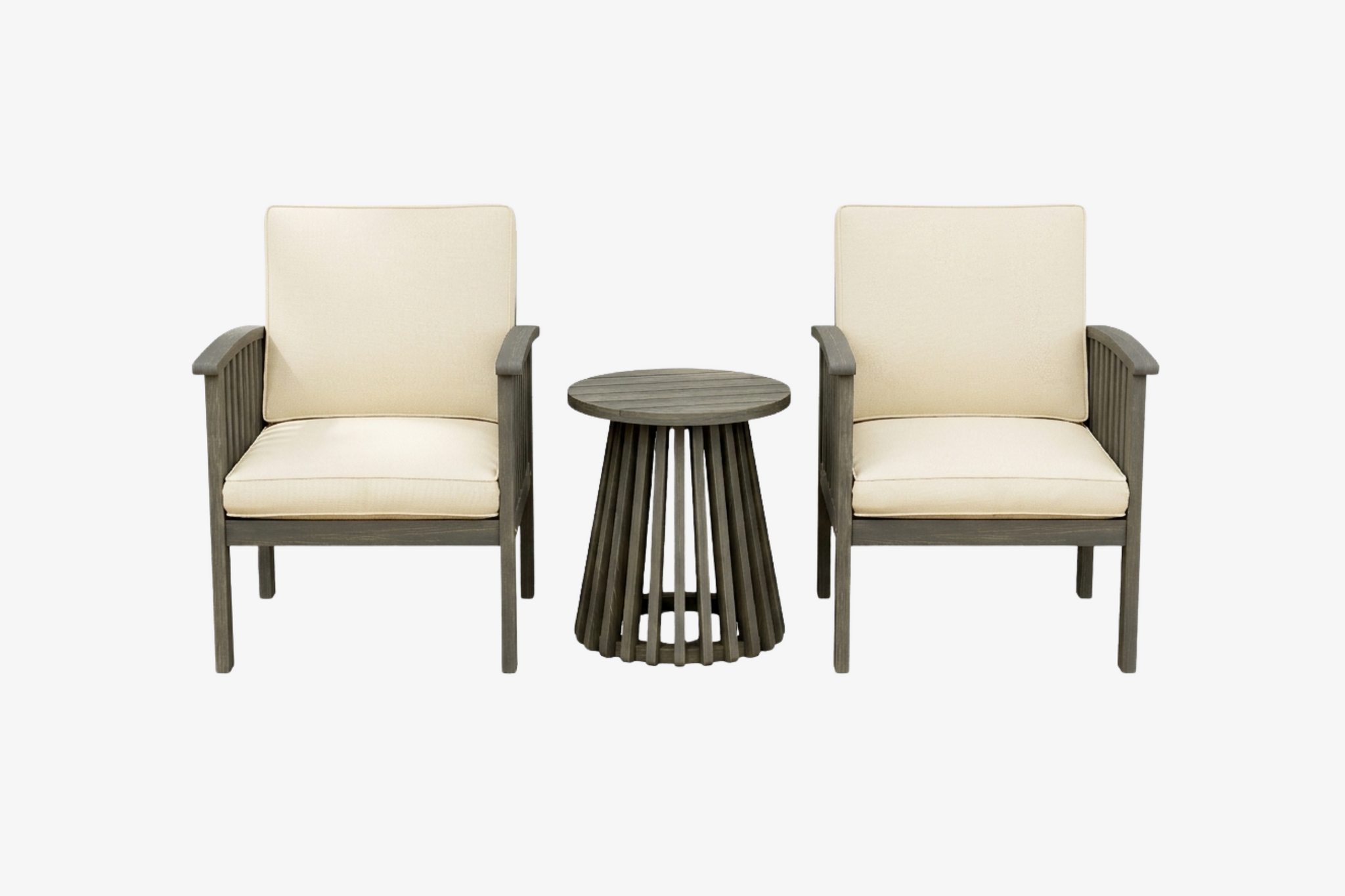 The durable Acacia wood chairs with water-resistant cream cushions and a stylish side table offer a polished outdoor look. Simple wipe-clean maintenance keeps your space guest-ready year-round.