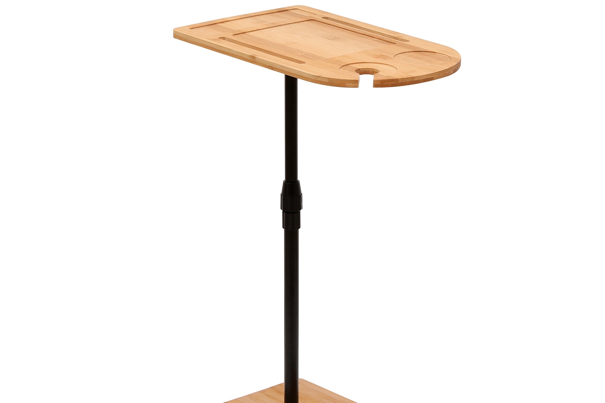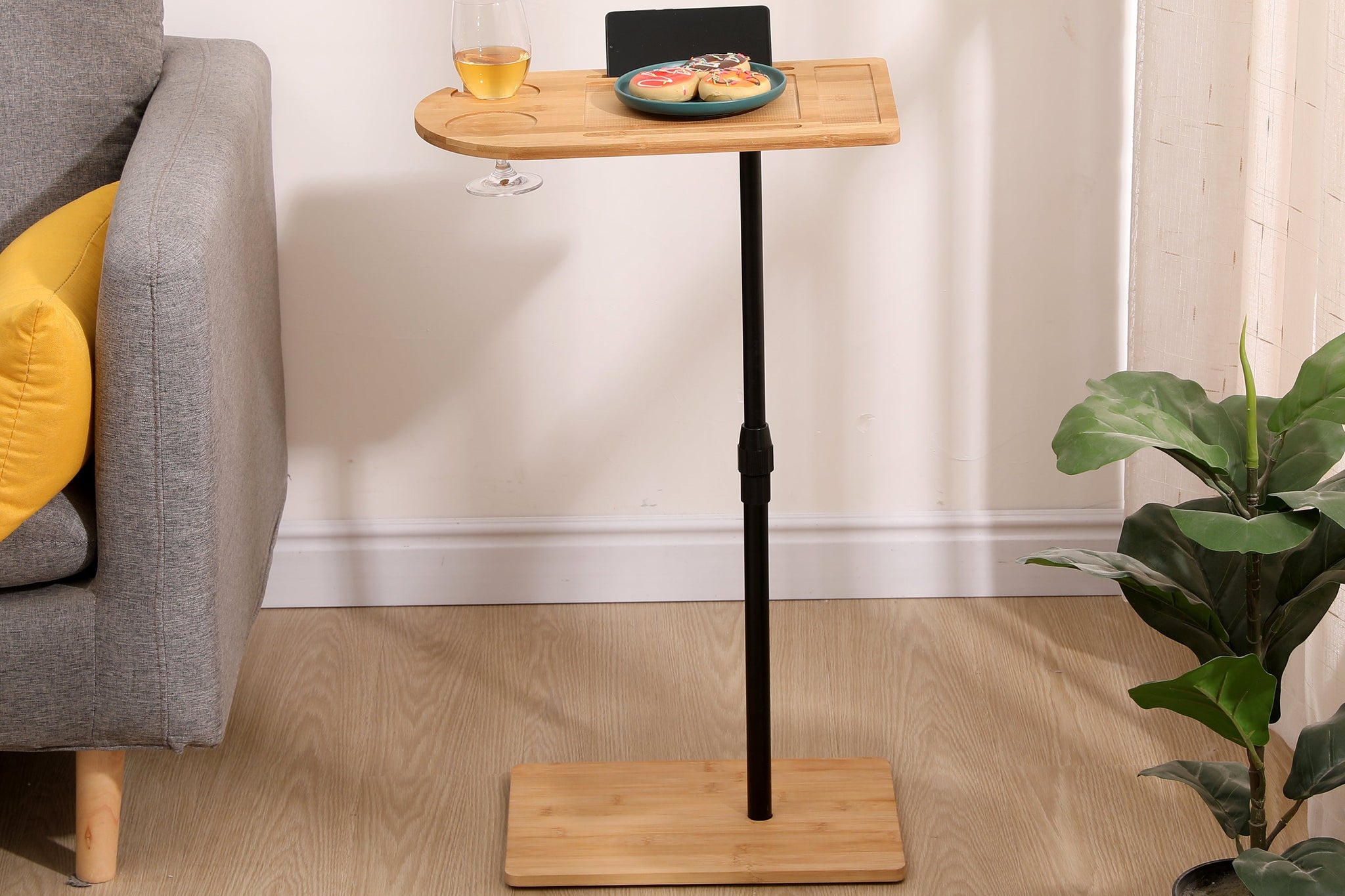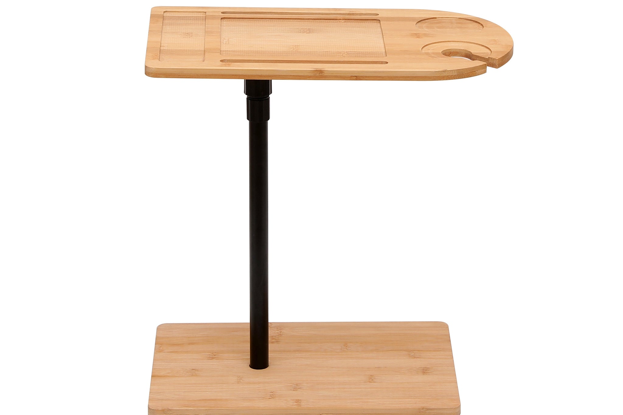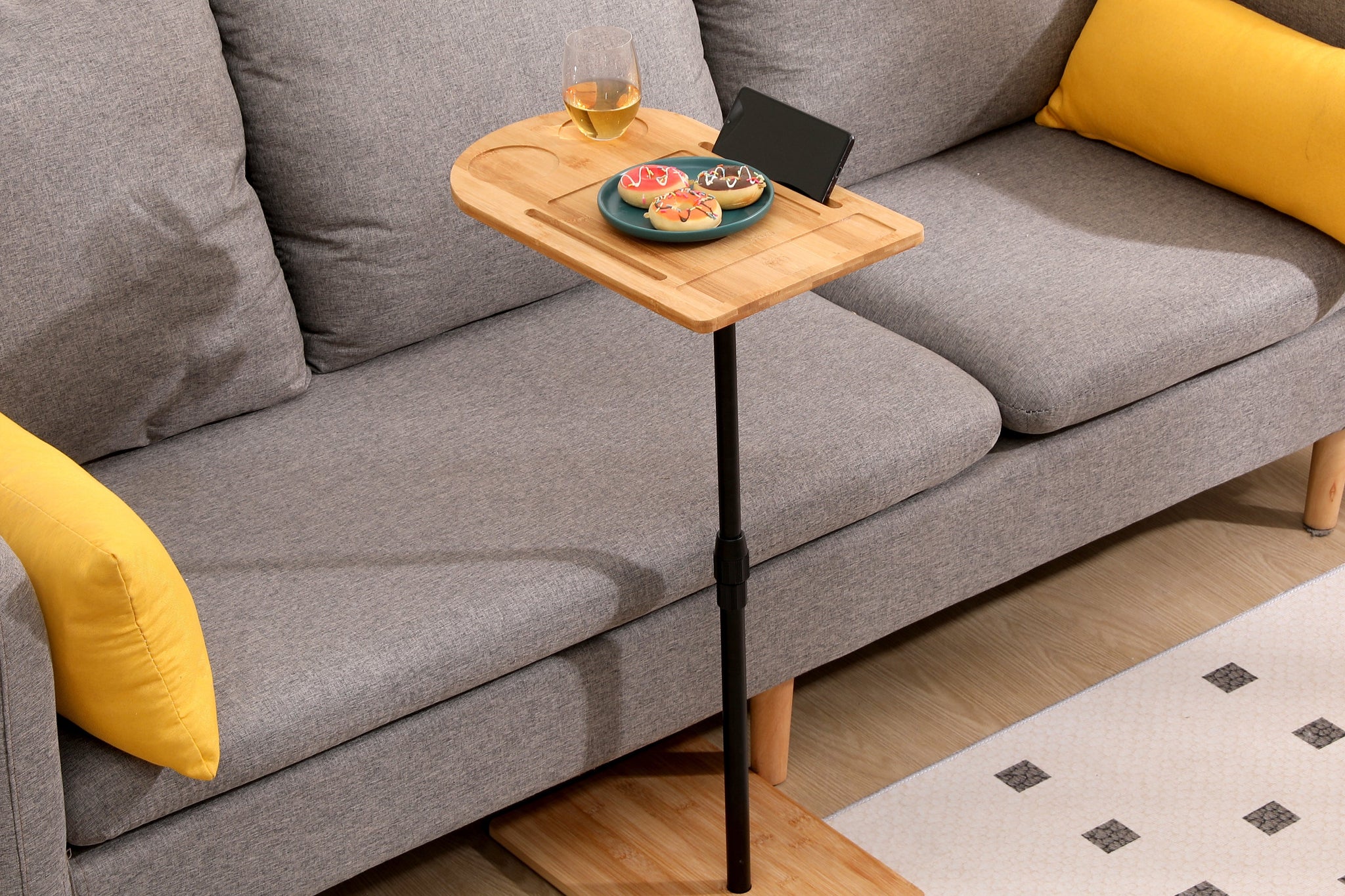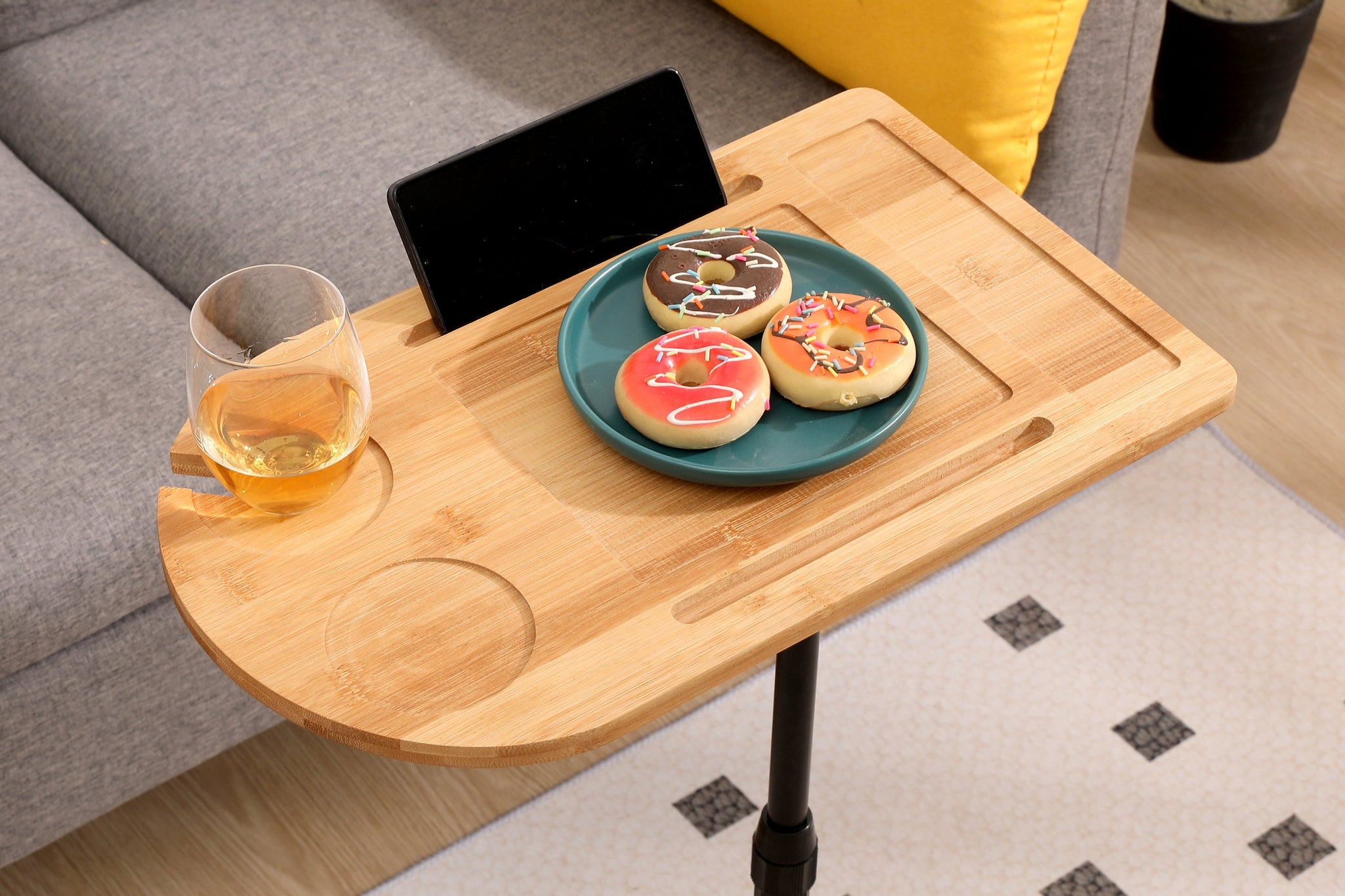 Slide this adjustable C-shaped table under your sofa to keep snacks and devices close. Its sturdy bamboo build and rotating tray reduce spills and strain while you relax or work.